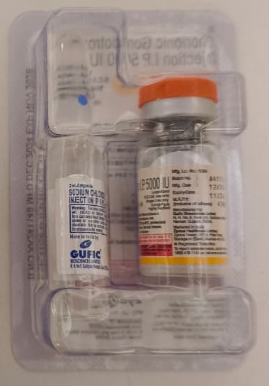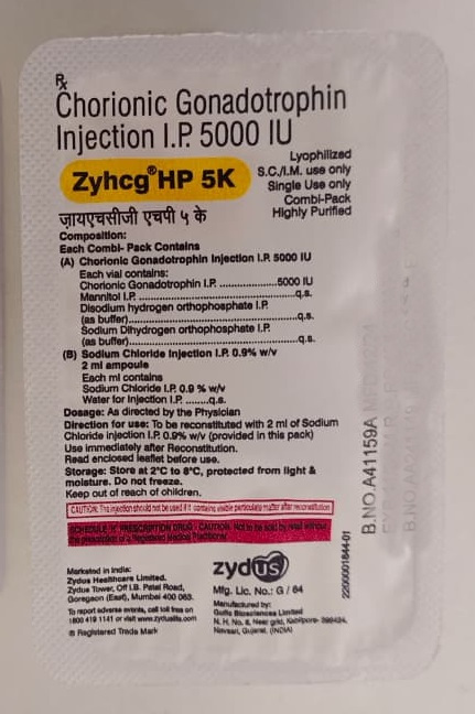 ZyhCG 5000iu manufactured by Gufic Biosciences Ltd. and marketed by German Remedies ( A division of Zydus Healthcare) (1 vial + 1 solvent in a box).